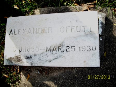 - [S3382] Magnolia Cemetery Burial Records, Burial Records, unknown repository, 502 North Boulevard, Baton Rouge, East Baton Rouge Parish, LA, USA, Alex Offutt. Born February 8, 1850 and died March 25, 1930. Buried in Section 3 Plot 37.