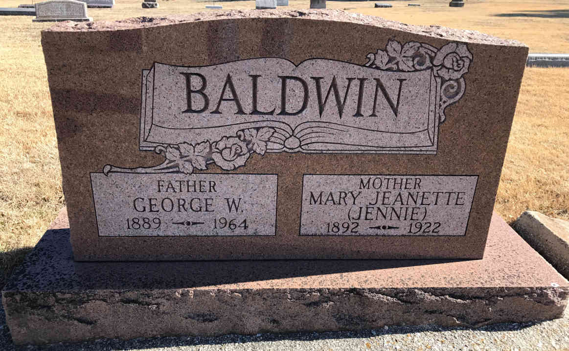 - [S1103] Find A Grave, online http://www.findagrave.com/cgi-bin/fg.cgi, Find A Grave Memorial #32957926. Photo of grave marker. "BALDWIN FATHER GEORGE W. 1889 - 1964 MOTHER MARY JEANETTE (JENNIE) 1892 - 1922."