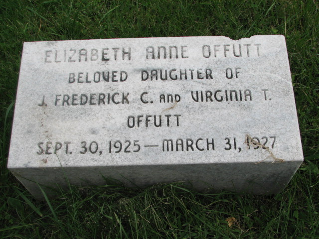 Elizabeth Anne Offutt was born on September 30, 1925.1 She died on March 31, 1927 at Union Memorial Hospital, Baltimore, MD, USA