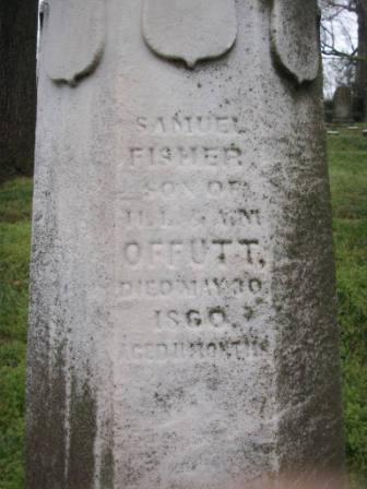 - [S3968] Evening Star, May 30, 1860, Pg. 3, Obituary states that on the morning of the 30th, at 2 o'clock, Samuel Fisher, infant son of H. L. and Sara M. Offutt, aged 11 months.