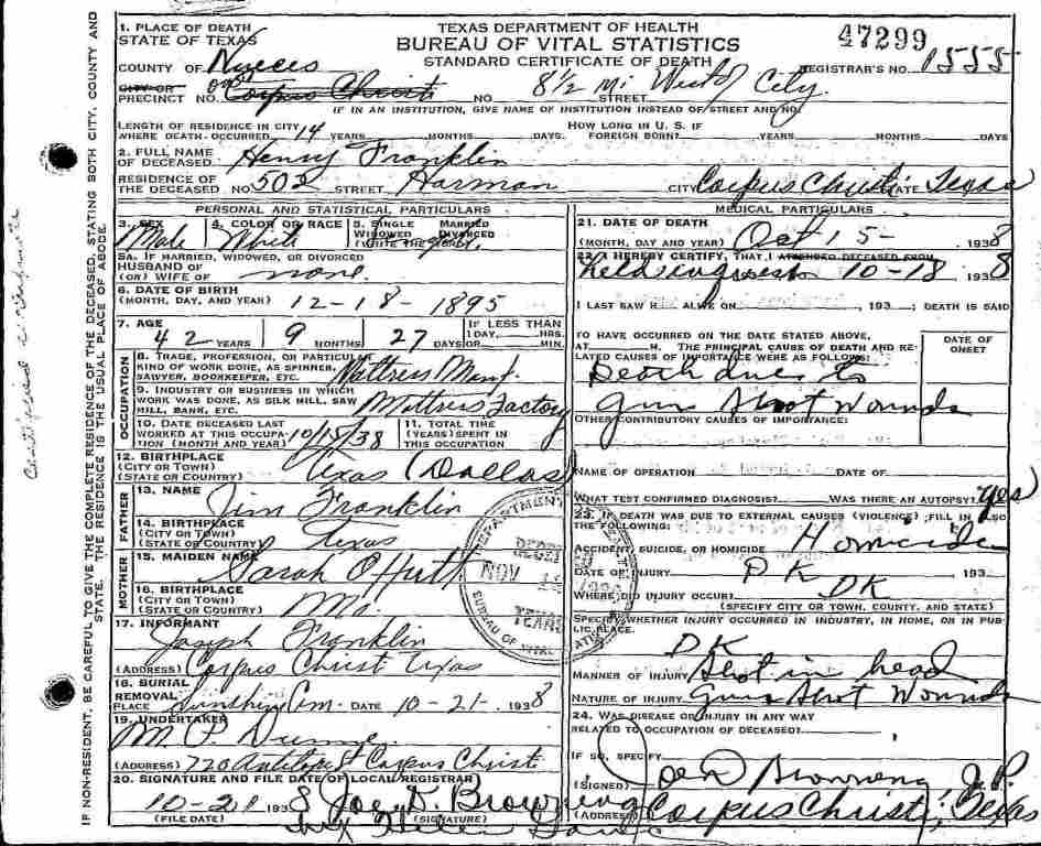 6 Henry Franklin died on October 15, 1938 at Nueces County, TX, USA