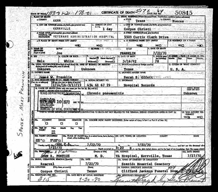 5 He died on September 22, 1970 at Veterans Administration Hospital, Kerrville, Kerr County, TX, USA