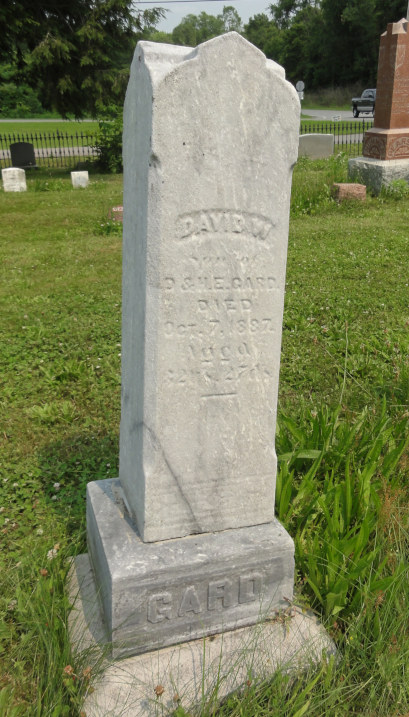 - [S1103] Find A Grave, online http://www.findagrave.com/cgi-bin/fg.cgi, Find A Grave memorial #8734954. Photo of grave marker. "DAVID W. Son of D. & H. E. GARD DIED OCT. 7, 1887". Memorial has that he was buried in the 10th row from back s/w corner of cemetery.